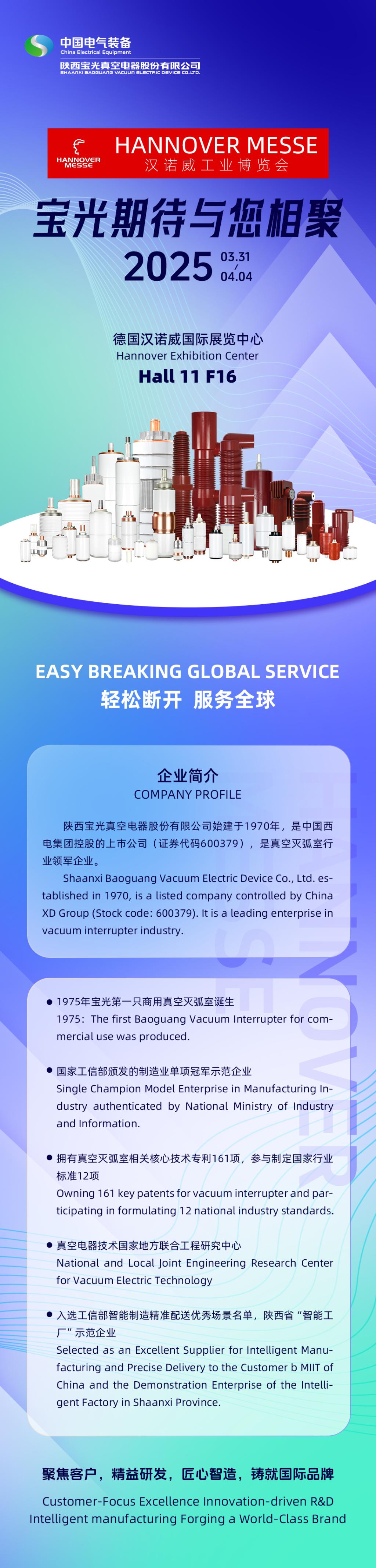 Shaanxi Baoguang Vacuum Electric Device Co., Ltd. will showcase our latest technological achievements and showcase products such as vacuum interrupter, vacuum circuit breaker, and RMU from Baoguang Group subsidiaries on site. We sincerely invite partners and customers to come and negotiate with us. Let's explore the future of industry together!