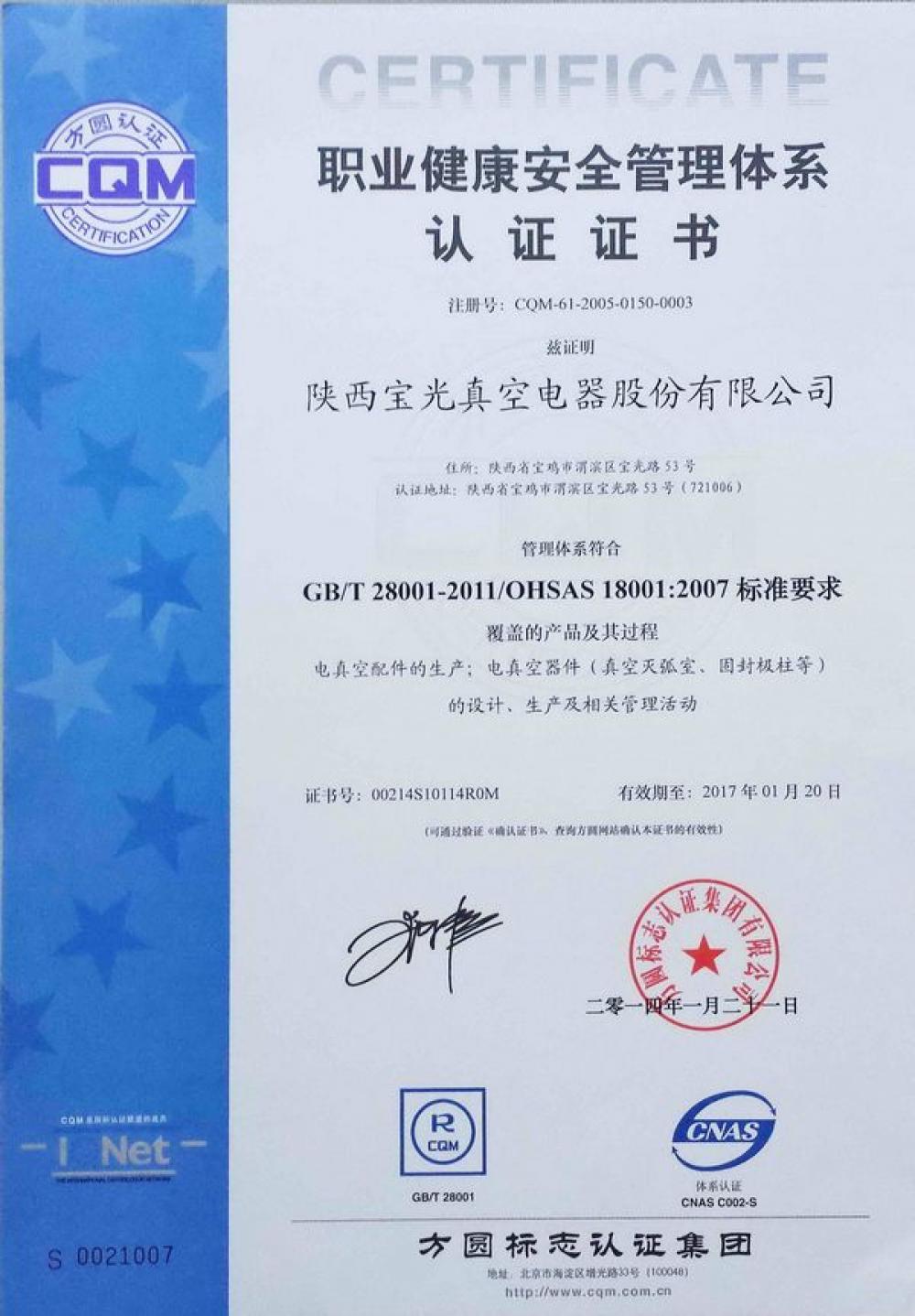 • 2014年通過OHSAS 18001:2007職業健康安全管理體係認證