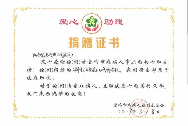 近日,寶雞市殘疾人福利基金會工作人員專程前來,為一起草 www.17c.com進出口公(gōng)司送來了“愛心助殘捐贈證書”,並代表基金會感謝進出口公司的捐贈行為。