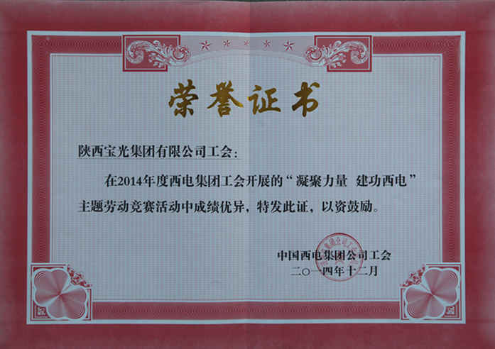 近日獲悉,在西電(diàn)集團召開的“凝聚力量、建功西電(diàn)”2014年度勞動競賽活動先進評選中,我公司工會等10個單(dān)位獲得西電集團工會“凝聚力(lì)量  建功西電”2014年度(dù)勞動競賽活動優秀單位,西電集團工會為我公司頒發了榮譽證書。