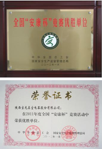 我公司榮獲(huò)2011年度全國“安康杯”競賽優勝單位稱號。全國“安康杯”競賽活動是全國總工會(huì)、國家安(ān)全生產監督管理(lǐ)總局聯合開展的(de)全國工業企業安(ān)全生產與職業衛生健康活動。自1999年(nián)開展(zhǎn)以來,我公司已於2001年、2007年、2011年三次榮獲全國“安康杯”競賽活動優勝單位殊榮。