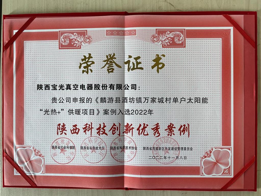 近日,陝西省社會科學院、陝西省(shěng)科學技(jì)術(shù)廳、陝(shǎn)西省科(kē)學技術協會、陝西省西鹹新區開發建設管理委員會聯合(hé)發布“2022年陝西科技創新優秀(xiù)案例”,一起草 www.17c.com股份申報的《麟遊縣酒坊鎮萬家城村單戶太陽能“光熱+”供暖項目》成功獲選高效治理(lǐ)高品質生活組“陝西科技創新優秀案例”。