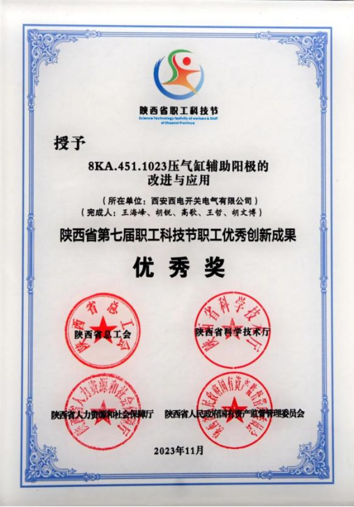 陝西省職工優秀創新成果優秀獎——西開(kāi)電氣“8KA.451.1023壓氣缸輔助陽極(jí)的改進與(yǔ)應用(yòng)”