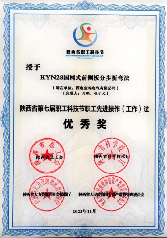 陝西省職工先進操作(工作)法優秀獎——西電寶雞電氣“KYN28國網式前側板分步折彎法”