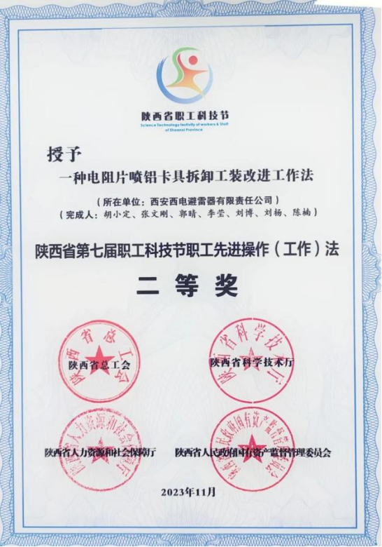 陝西省職工先進操作(工作)法二等(děng)獎——西電避雷器“一(yī)種電阻(zǔ)片噴鋁卡具拆遷工裝改進工作法(fǎ)”