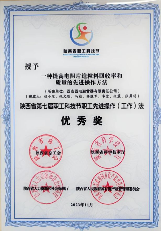 陝西省職工先進操作(工作)法優秀獎(jiǎng)——西電避雷器(qì)“一種提高電阻片造粒料回收率和質量(liàng)的(de)先(xiān)進操作方法”