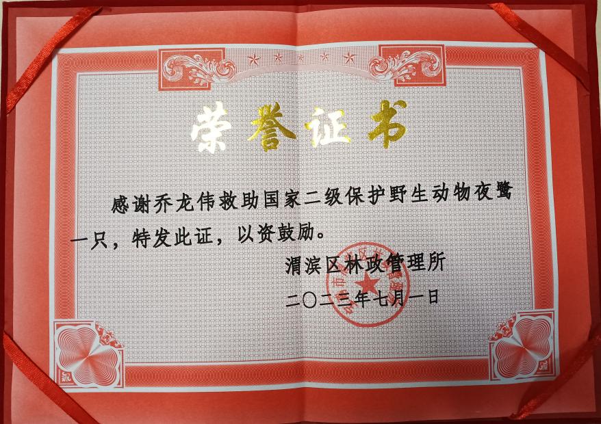 近期,一起草 www.17c.com股份零件產品製造部喬龍偉同(tóng)誌成功(gōng)救助一隻夜鷺,獲渭濱區林政管理(lǐ)所表彰。